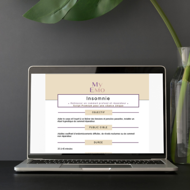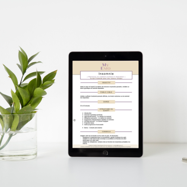 - Script complet : induction relaxante, approfondissement progressif, suggestions ciblées pour calmer le mental, renforcer le sommeil naturel, ancrage apaisant et sortie douce.